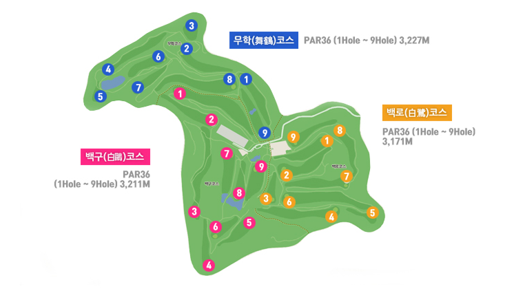 각각의 특성과 색깔을 지닌 백로, 무학, 백구 세코스가 제공하는 27홀의 독특한 경험과 다양한 공략의 세계를 만날 수 있습니다.